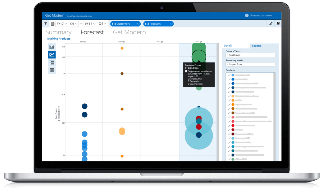 The primary design challenge was to provide clear visibility into upcoming end-of-support events. Primary users were internal, upper-level Product Managers and market-facing Account Reps. The tool informed those users of upcoming risks, allowing clear planning and communication.